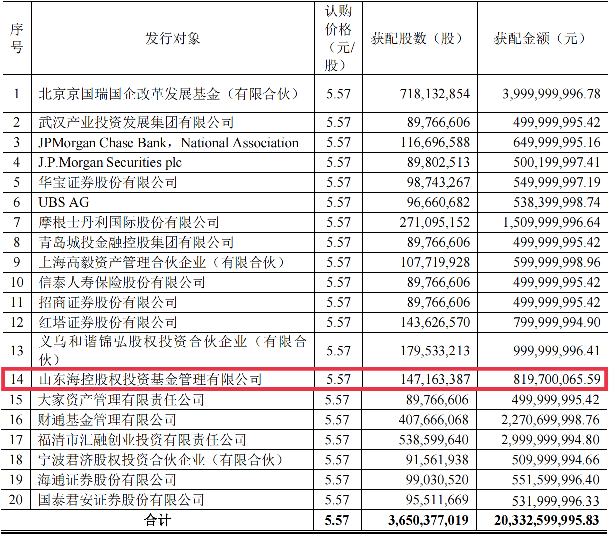 8月18日,京東方A(00725)披露非公開發(fā)行A股股票發(fā)行情況報告書,共發(fā)行股票36.5億股,募集資金203.33億元,??丶瘓F旗下基金公司—山東??毓蓹?quán)投資基金管理有限公司(以下簡稱“??刭Y本”)認購約8.2億元,成功完成資本市場首秀。