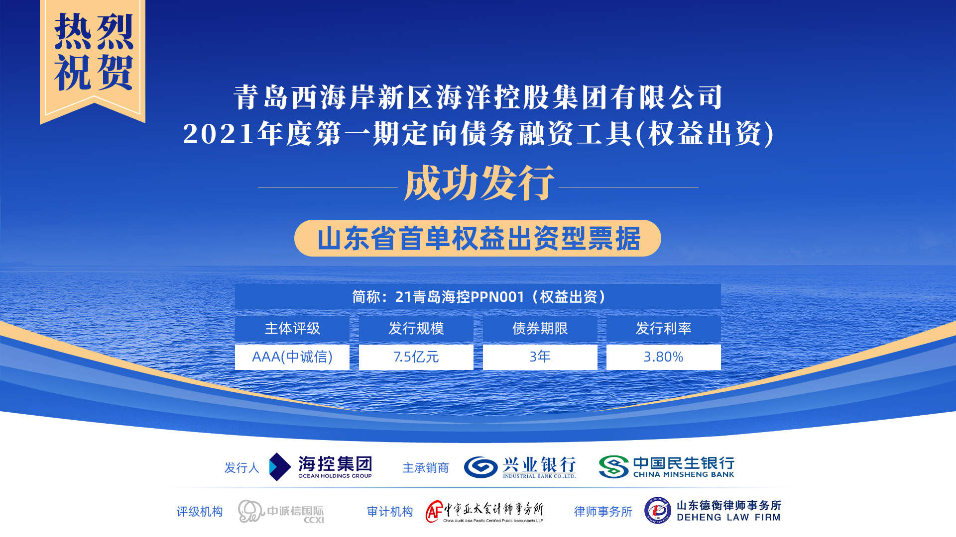 近日,“青島西海岸新區(qū)海洋控股集團(tuán)有限公司2021年度第一期定向債務(wù)融資工具(權(quán)益出資)”成功發(fā)行,發(fā)行金額7.5億元,期限3年,為山東省首單權(quán)益出資型票據(jù)。
