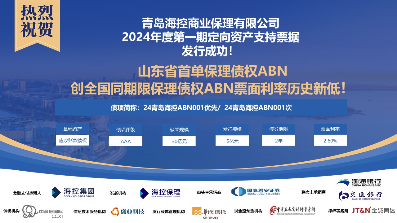 6月18日,青島??厣虡I(yè)保理有限公司(以下簡(jiǎn)稱“海控保理”)2024年度第一期定向資產(chǎn)支持票據(jù)(ABN)成功發(fā)行,是山東省首單保理債權(quán)ABN。該產(chǎn)品發(fā)行規(guī)模5億元,期限2年,票面利率2.6%,創(chuàng)全國同期限保理債權(quán)ABN票面利率歷史新低。