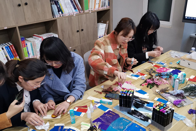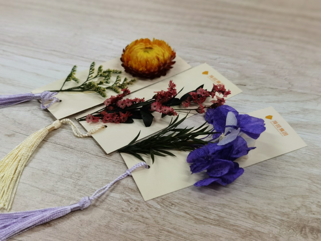 現(xiàn)場擺放有集團(tuán)定制logo書簽、空白書簽、干花和各色馬克筆。在學(xué)習(xí)小組和文藝小組的帶領(lǐng)下,大家用手中的畫筆和工具,在書簽上揮灑著創(chuàng)意與靈感。